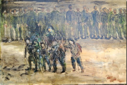 満洲での戦争体験を描いたもので、兵隊たちの前を逃げ惑う母子像が