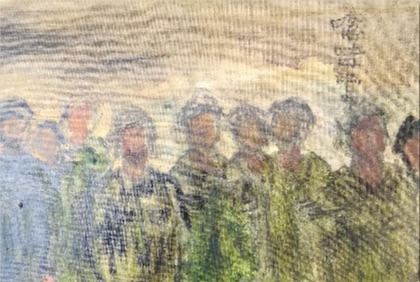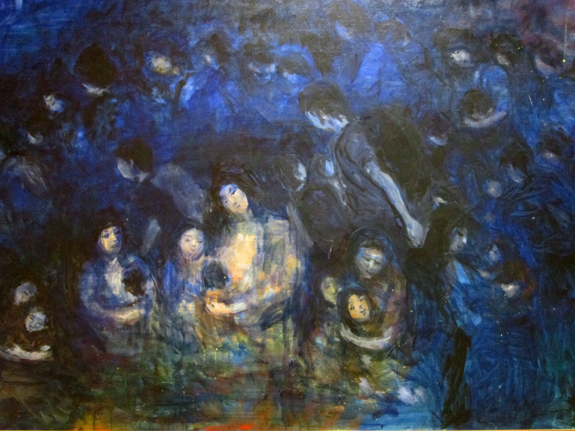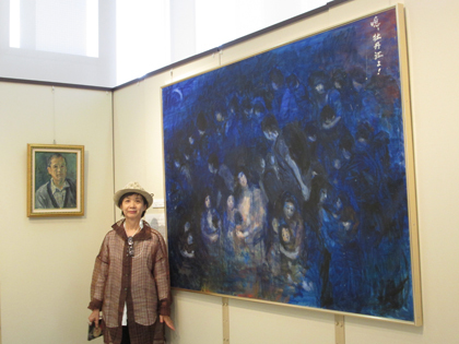 テレビでみたイラク戦の映像から、胸の奥に沈殿させていた満洲での戦争体験を思い起こし、それを昇華させて描いたのでしょう。引揚船を待つ人々の群れは、よくみると、中央には赤子に乳を与える母親と子どもたち、そして周囲には16組もの母子たちが描かれていることが、展示を重ねるごとにわかってきました。三日月の浮かぶ夜空、一面のブルーの色彩のなかに母子たちがぼうっと浮かび上がる、なかなかない構図の戦争体験画です。