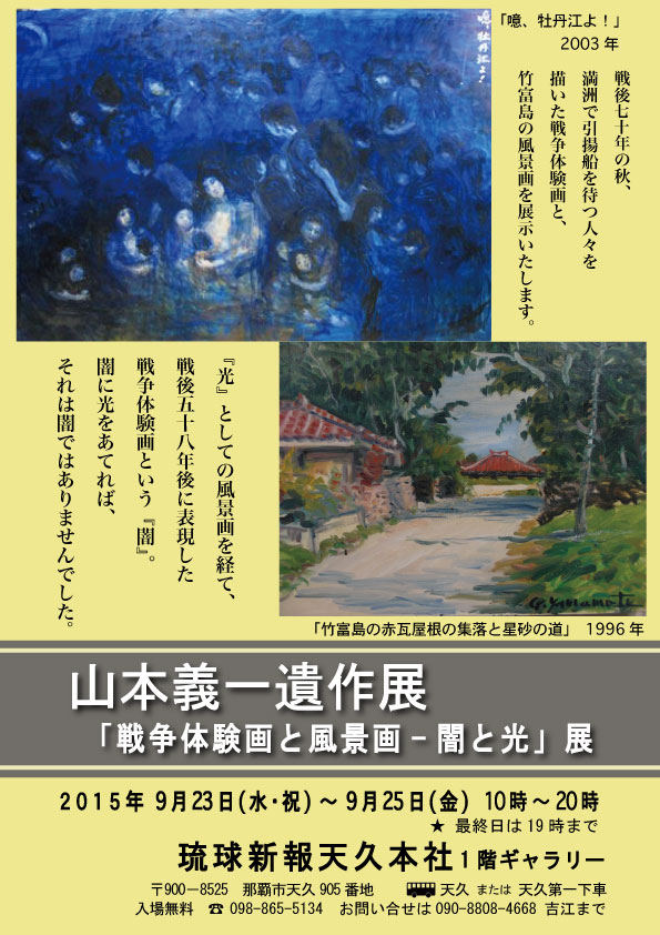 竹富島滞在後の2003年、イラク戦の頃、戦争から58年たってようやく義一は自らの戦争体験を絵にしたのであった。それは、戦地としての沖縄ではない、桃源郷のような竹富島の風景に触れて、ようやく心の底にしまいこんでいたものを昇華させ、絵に描くことで浄化することができたからではないかと思う。