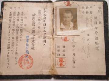 この『満洲生活必需品株式会社』発行の写真付き社員身分証明 書証明書が残っている。また昭和 34 年に提出した『外地における 状況、引き揚げの状況等に関する申立書』、『引揚者給付金請求 書』によって、満洲新京特別市大同大にあった当時の会社の住所 や、南新京興亜街の「大鵬寮」という名前の会社の寮に住んでい たことがわかる。