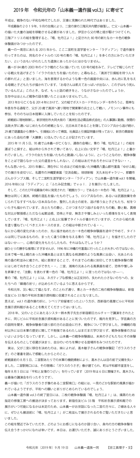 竹富島滞在後の2003年、イラク戦の頃、戦争から58年たってようやく義一は自らの戦争体験を絵にしたのであった。それは、戦地としての沖縄ではない、桃源郷のような竹富島の風景に触れて、ようやく心の底にしまいこんでいたものを昇華させ、絵に描くことで浄化することができたからではないかと思う。