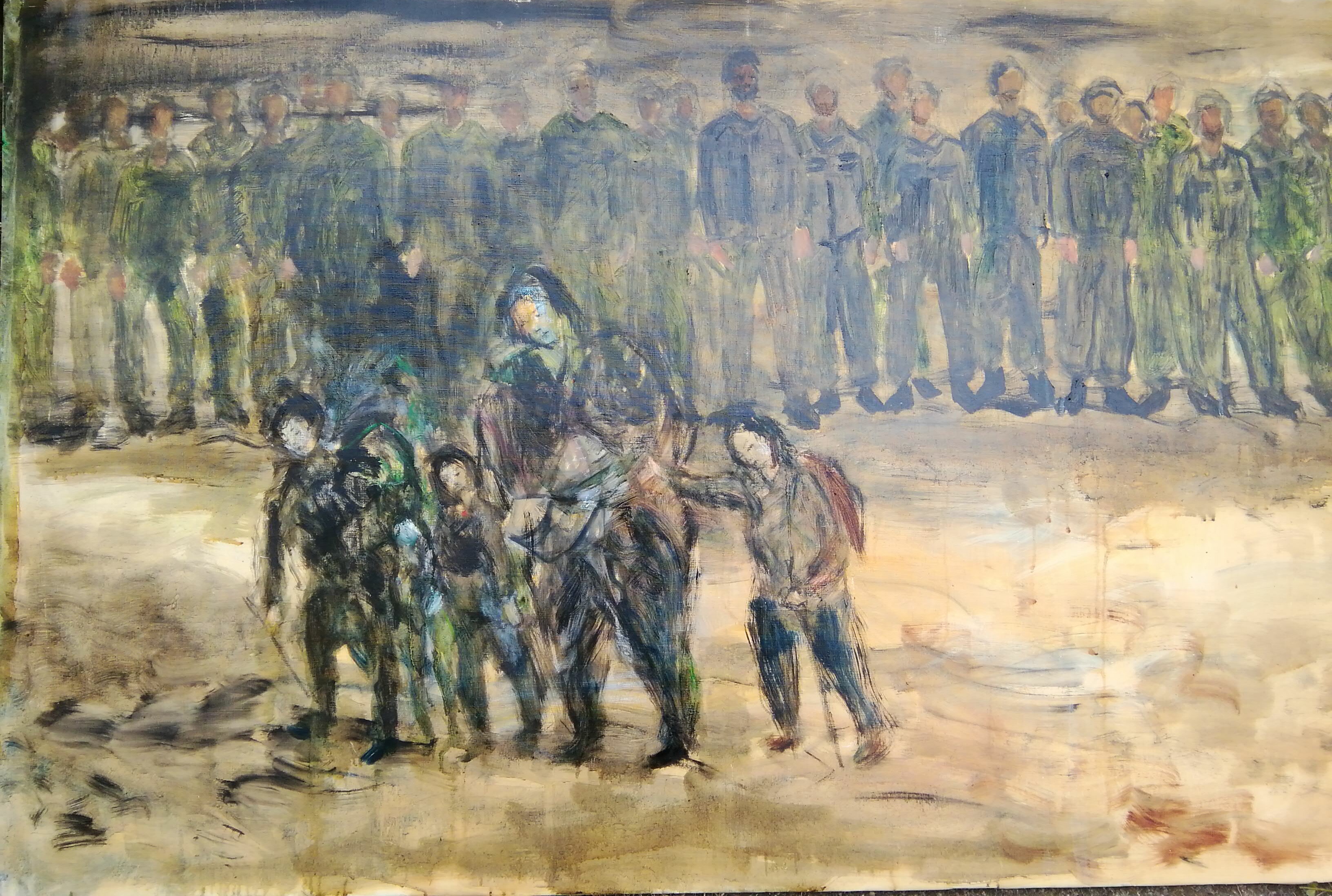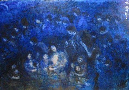ちょうどこの絵は 2003 年のイラク戦の頃に描いていたので、イ スラムのベールをかぶった女たちを描いたものかと義一本人に聞 いたところ、「牡丹江で引揚船を待つ人々の群れを描いた」と言 っていた。そのときには絵の右上に文字は書かれていなかったと 思う。
