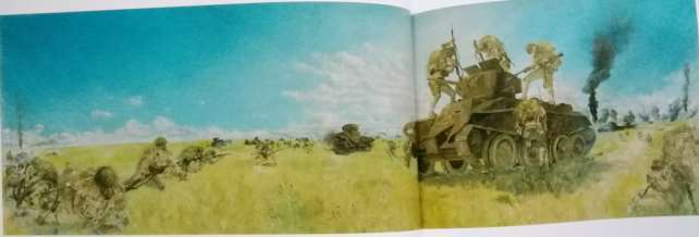 当時、日本は満州国を建設し、大陸に進出しようとしていた。 モンゴル人民共和国軍と満州国軍の国境線をめぐっての衝突をき っかけに、日本とソ連は 1939 年のノモンハン事件など国境紛争を 起こす。日ソともに甚大な被害を出し、ソ連の勝利に終わったこ の名高いノモンハン事件に、義一も参加したという。画家の藤田 嗣治が『ハルハ(正しくは漢字)河畔之戦闘』としてノモンハン 事件を題材に絵を描いており、隠れるもののない広大な緑の大地 に匍匐前進してソ連軍の戦車に近づいていく日本兵の死を覚悟し た戦いぶりがわかる。(『画家と戦争』平凡社ムックより複写)